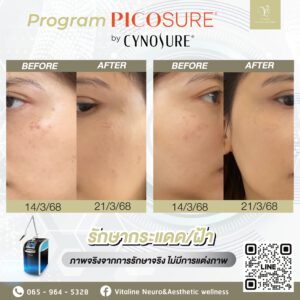 | ฟื้นฟูผิวโดยไม่ลอก/ไม่มีแผล | ใช้พลังงานที่เร็วระดับล้านล้านวินาที (ps) จึงไม่เผาผิว → ไม่มี downtime |